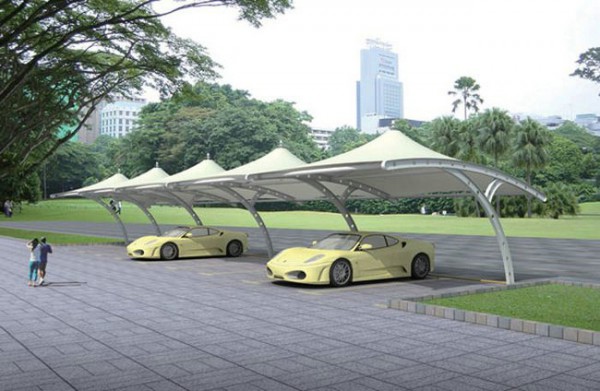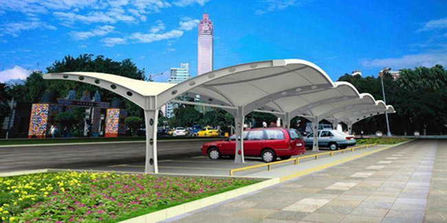 膜結構停車棚以一種類似帳篷、充滿柔性的建筑越來越多地出現(xiàn)在城市廣場、公園邊上,以其優(yōu)美的曲線吸引了大眾的目光,其造型自由輕巧、阻燃、制作簡易、安裝便捷、節(jié)能、易于使用。作為一種特殊的現(xiàn)代建筑結構,以高強度柔韌性薄膜材料與張拉體系相結合,形成的具有一定剛度的空間結構體。